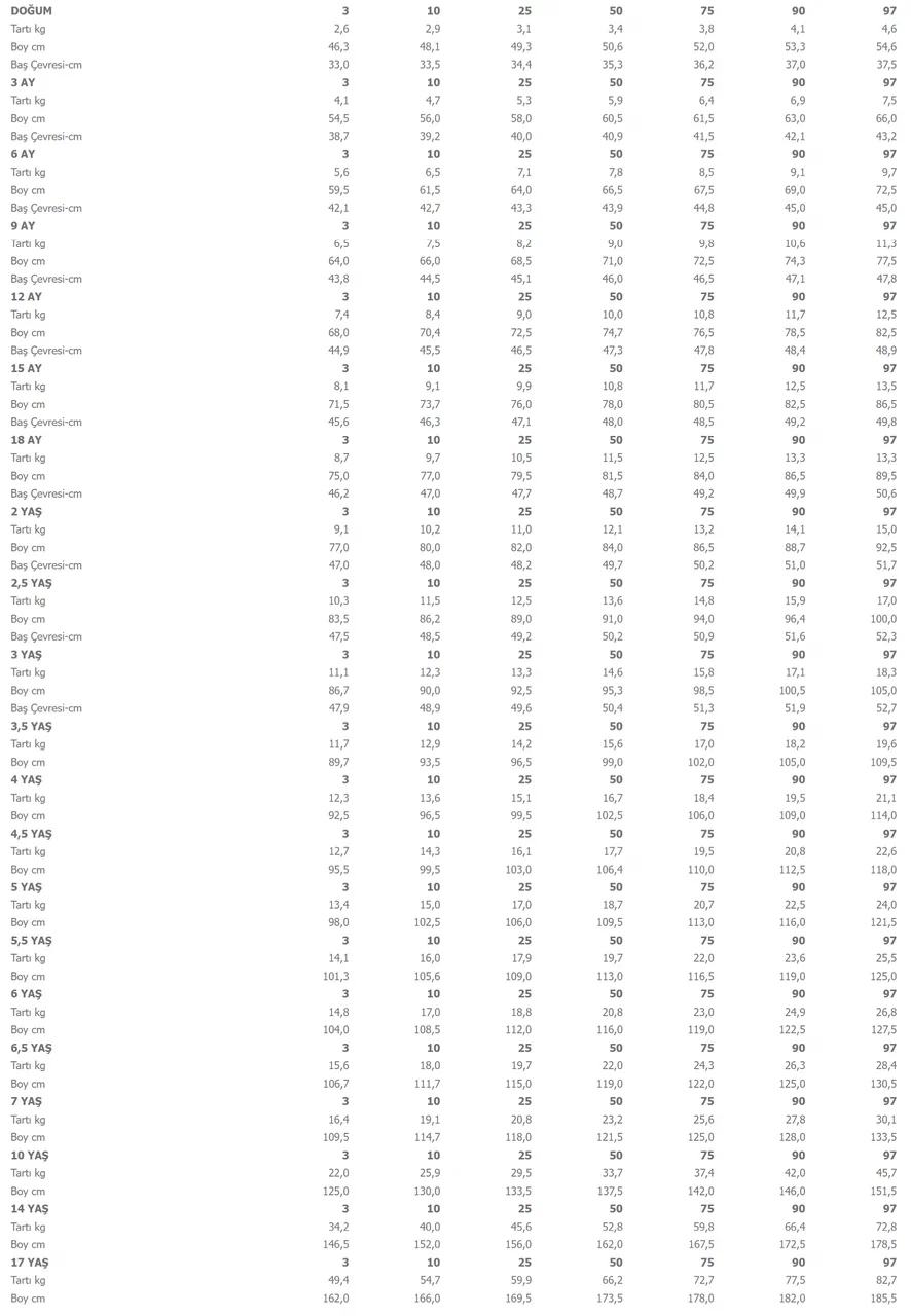 Erkek Çocuklar İçin Persentil Tablosu